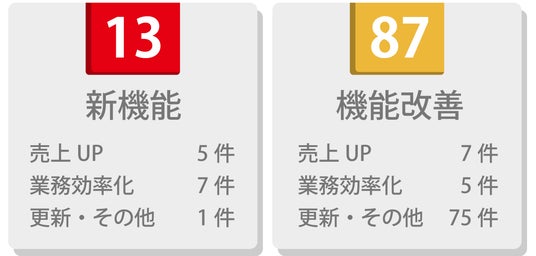 新機能については売上アップ機能5件、業務効率化7件、更新・その他1件の合計13件、既存機能のアップデートは、売上アップ機能7件、業務効率化5件、更新・その他75件の合計87件となっています。