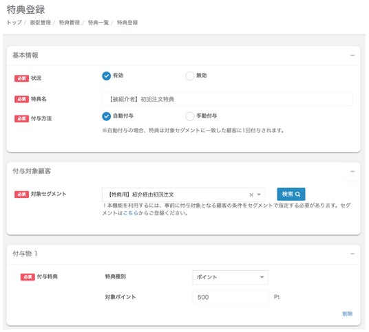 特典の種類はポイント、クーポン、会員ランクから選択でき、既存顧客を特定の条件でグルーピングした「セグメント機能」と併せて利用することで、柔軟な設定が可能となります。