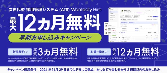 10月9日(水)から、Wantedly Hireの利用料が最大で12カ月無料になる「早期お申し込みキャンペーン」を行っています。好評につき、キャンペーン期間の延長を決定し、2024年11月29日(金)まで実施します。ぜひこの機会にお試しください。