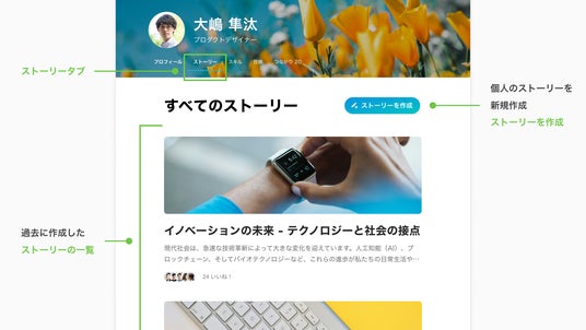次に、プロフィールページに「ストーリータブ」を追加。画面右上の「ストーリーを作成」ボタンから個人のストーリーを執筆できるほか、過去に作成したストーリーを一覧で確認できるようになりました。