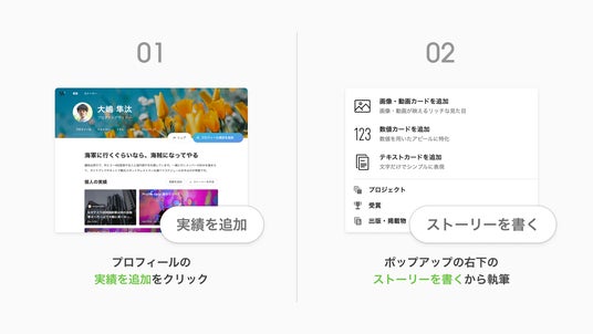 まずトップページに「個人の実績を追加」の欄を設置。同欄をクリックして表示されるポップアップの右下の「ストーリーを作成」ボタンから執筆できるようになりました。