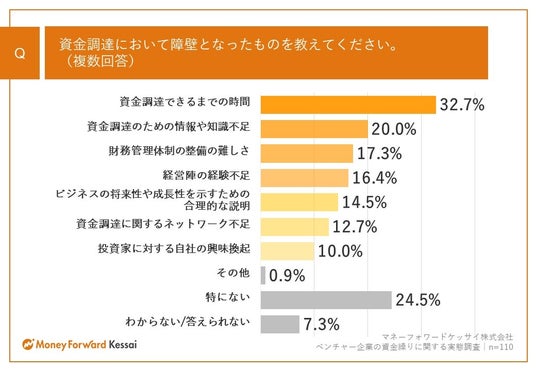 調査の結果、65.5%のスタートアップが目標額の資金を調達できたと回答した一方、目標額の調達ができなかったスタートアップは資金調達の障壁として、「資金調達できるまでの時間」(32.7%)、「資金調達のための情報や知識不足」(20.0%)や「財務管理体制の整備の難しさ」(17.3%)を挙げました。