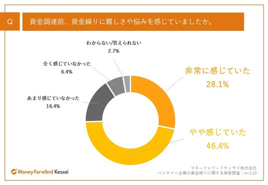 「資金調達前、資金繰りに難しさや悩みを感じていましたか。」と質問したところ、「非常に感じていた」が28.1%、「やや感じていた」が46.4%という回答となりました。