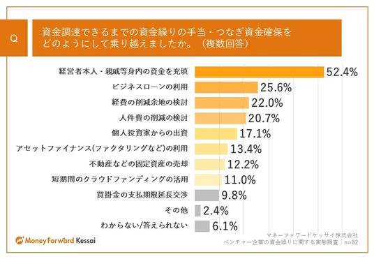 また、7割以上が資金調達前に資金繰りに難しさや悩みを感じた経験があると回答しており、資金調達できるまでの資金繰りの繋ぎ資金確保については、52.4%が「経営者本人・親戚等身内の資金を充填」していました。