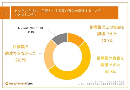 「あなたの会社は、目標とする金額の資金を調達することができましたか。」と質問したところ、「目標額以上の資金を調達できた」が13.7%、「目標額の資金を調達できた」が51.8%、「目標額を調達できなかった」が22.7%という回答となりました。