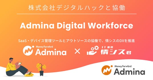 マネーフォワードi株式会社は、『IT顧問 情シス君』を提供する株式会社デジタルハックと協働で、『Admina Digital Workforce』を提供します。情シス向け業務OS『マネーフォワード Admina』と、サービスを熟知したエキスパート人材による業務代行を組み合わせ、情シス業務の全体、または一部分をアウトソースできます。