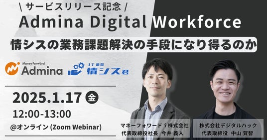 提供開始を記念し、2社合同でオンラインセミナーを開催します。「『Admina Digital Workforce』は情シスの業務課題解決の手段になり得るのか」をテーマに、本業務提携の背景などの概要に加え、具体的な事例等についてお話します。