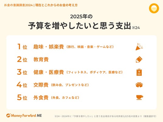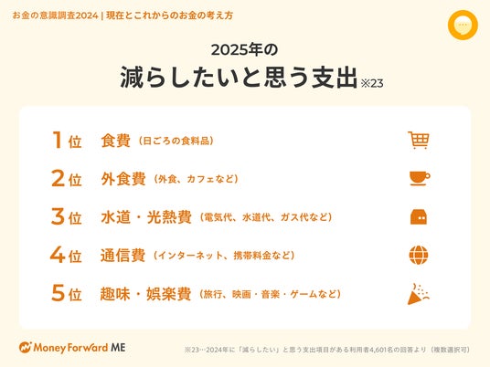 - 2025年に減らしたい支出1位は「食費(日ごろの食料品)」、予算を増やしたい支出1位は「趣味・娯楽費」。前回調査と同じ傾向に。