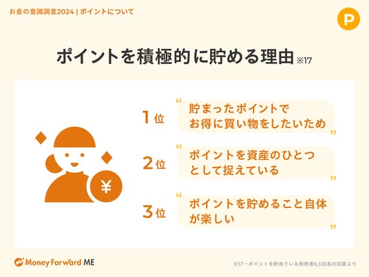 - ポイントを積極的に貯める理由に、1位「貯まったポイントでお得に買い物がしたい」、2位「ポイントを資産のひとつとして捉えている」、3位「ポイントを貯めること自体が楽しい」。