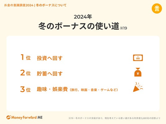- 冬のボーナスの使い道は、1位「投資へ回す」、2位「貯蓄へ回す」、3位「趣味・娯楽費」。