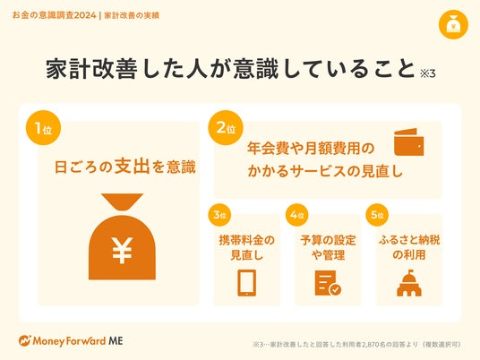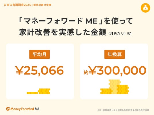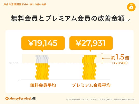 - 2024年、『マネーフォワード ME』の利用で家計改善を実感した人の改善額は、平均で月25,066円。プレミアム会員※1は月27,931円で、無料会員の金額の約1.5倍。