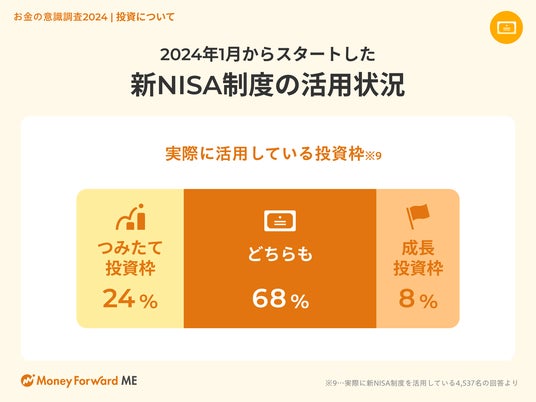また、2024年は新NISA制度の開始など、日本国内で投資に注目が集まりました。調査では、2024年を通して「投資に対して意識・興味関心が高まった」と67%の人が回答。そして新NISA制度を活用していると回答した人は全体の71%で、そのうち「つみたて投資枠および成長投資枠を併用している」人は68%でした。