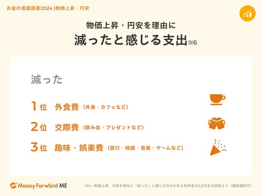 - 物価上昇、円安を理由に「減った」と感じる支出項目は1位「外食費」、2位「交際費」、3位「趣味・娯楽費」。