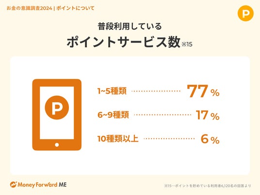 - 利用しているポイントサービス数は「1~5種類(77%)」「6~9種類(17%)」「10種類以上(6%)」という結果に。