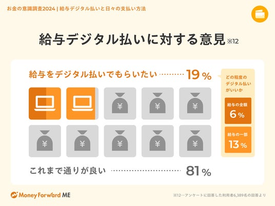 - 給与デジタル払いが導入された場合、給与をデジタルで貰いたいと回答したのは全体の19%。