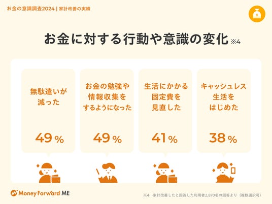 調査の結果、『マネーフォワード ME』を利用して家計改善を実感した人のうち49%は「無駄遣いが減った」「お金の勉強や情報収集をするようになった」と回答し、平均で月25,066円(年間約30万円)の改善を実感しています。昨年から続く物価上昇や円安の中でも、サービスを利用することで家計改善に繋がっていることが分かりました。