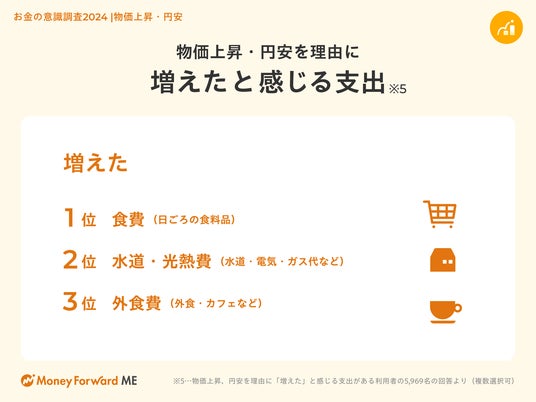 - 物価上昇、円安を理由に「増えた」と感じる支出項目は1位「食費(日ごろの食料品)」、2位「水道・光熱費」、3位「外食費」。