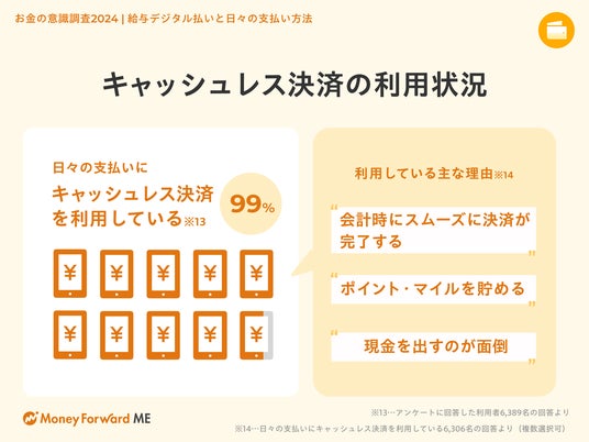 - キャッシュレス決済を利用している人は全体の99%。その理由の上位は「会計時にスムーズに決済が完了するため」、「ポイント・マイルを貯めるため」、「現金を出すのが面倒なため」。