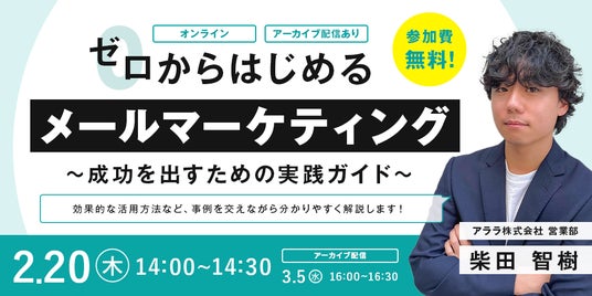 ペイクラウドホールディングス株式会社(東証グロース:4015)の傘下で各種ITソリューション事業を展開するアララ株式会社(本社:東京都港区、代表取締役社長:門倉 紀明)は、株式会社東京海上日動パートナーズTOKIO(本社:東京都渋谷区、代表取締役:豊田 晃)と共催でWebセミナー「ゼロからはじめるメールマーケティング~成果を出すための実践ガイド~」を2025年2月20日(木)に、アーカイブ配信を2025年3月5日(水)に開催することをお知らせいたします。