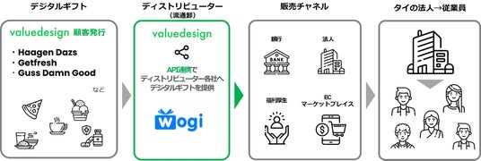 バリューデザイン(タイ)では、福利厚生としてデジタルギフトの導入を検討する法人向けに販売を開始します。シンガポールを拠点にデジタルリワードやインセンティブサービスを提供するWOGIをディストリビューションパートナーとして迎えることで、WOGIが連携する通信、銀行、保険など様々な業界へバリューデザインの顧客が発行するデジタルギフトを提供します。また、ディストリビューション先の販売チャネルを介し、タイの法人へ福利厚生サービスとしてデジタルギフトの提供を推進していきます。両社はAPIの円滑な統合で、電子ギフトの追跡、アクティベーション、リアルタイムでの引き換え管理を実現します。なお、2025年4月1日から、ハーゲンダッツ、ゲットフレッシュ、Guss Damn Goodのデジタルギフトの取扱いをWOGIのプラットフォーム上で開始。今後順次デジタルギフトの種類を増やしていく予定です。