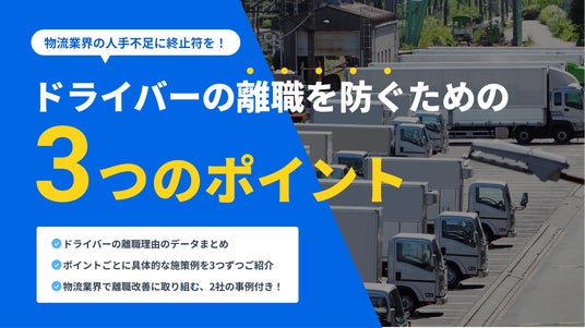 そこで本資料では、ドライバーが離職してしまう原因を3つのカテゴリに分類した上で、人手不足に悩む物流業界の方向けにドライバーの離職を防ぐための3つのポイントと、具体的な施策を紹介します。