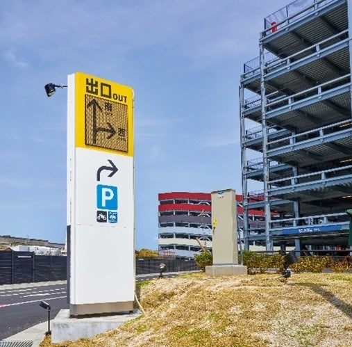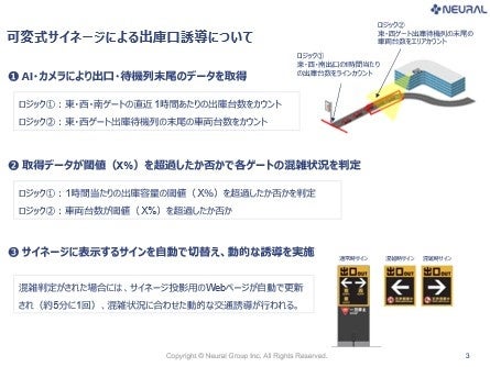 ニューラルグループでは、この対策の一環として、最先端のエッジAI ソリューション「デジパーク」を搭載した5台のエッジAIによりすべての出口の直近1時間あたりの出庫台数および出庫待ちの待機列末尾の台数を常時データ化し、出口のリアルタイム混雑判定を実施しています。混雑判定結果に対応して、立体駐車場や三叉路等の施設内の計5か所に設置されているLED サイネージの方向指示が自動的に変更されます。