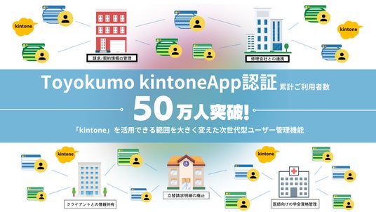 「情報サービスをとおして、世界の豊かな社会生活の実現に貢献する」を理念に掲げ、ビジネス向けのクラウドサービスを提供するトヨクモ株式会社(本社:東京都品川区、代表取締役社長:山本 裕次、以下トヨクモ)は、サイボウズ株式会社(本社:東京都中央区、社長:青野 慶久、以下サイボウズ)が提供する業務改善プラットフォームである「kintone」と連携する次世代型ユーザー管理機能「Toyokumo kintoneApp認証」の累計ご利用者数が、50万ユーザーを突破したことをお知らせします。2024年5月に40万ユーザー突破のリリースを出しており、約3ヶ月で10万ユーザー増加しました。