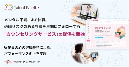 株式会社プラスアルファ・コンサルティング(本社:東京都港区、代表取締役社長:三室克哉)は、働き方改革や健康経営、リモートワーク、人材の採用難、離職防止などを背景に、多くの企業で導入が進んでいるタレントマネジメントシステム「Talent Palette(以下:タレントパレット)」において、健康経営を促進するうえで不可欠な、社員のストレス・不安などの心理的問題の解決を支援する「カウンセリングサービス」を提供します。