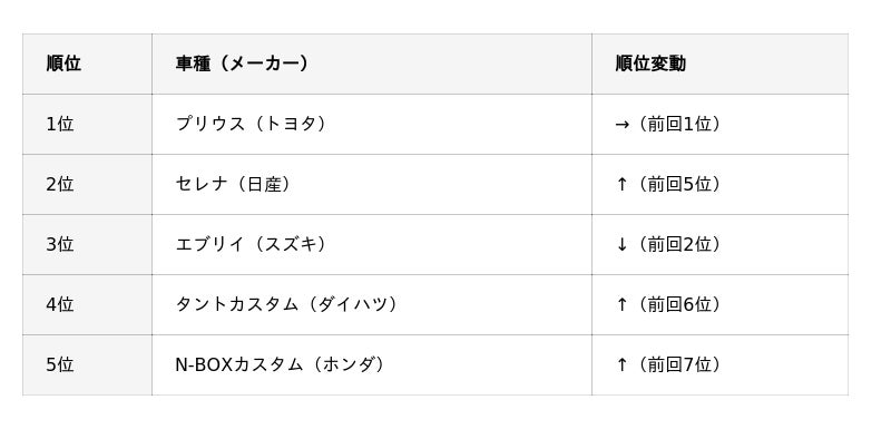 「車選びドットコム」の市場動向から調査した、国産車の2025年5月中古車販売ランキングを紹介します。