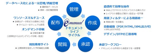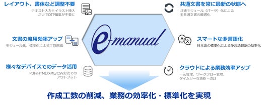 「e-manual」は、マニュアルの制作、承認、公開まで一括して管理することができるクラウドサービスです。専門知識がなくても、簡単な操作でレイアウトが整ったマニュアルを作成でき、PDFやHTML形式で出力できます。また、「見出しタイトル」、「本文」、「表」、「画像」など、マニュアルを構成する要素をパーツとして管理し、そのパーツを組み合わせることでマニュアルを作成する仕組みとなっています。このような仕組みとすることで、共通化されているマニュアルは一度の修正で同一箇所をすべて更新できます。特に、工業製品の製品開発および制作工程といった、膨大な量になるマニュアルの作成・管理に強みがあります。