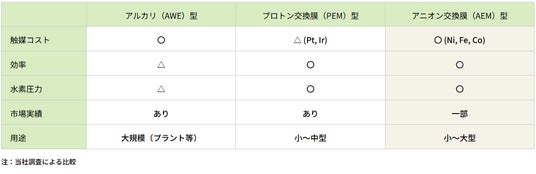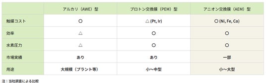 - アニオン交換膜(AEM)型AEM型は、アルカリ性環境下で動作し、電解質としてアニオン交換膜を使用する新しい方式です。低コストで貴金属を必要としない可能性があるため、注目されています。ただし、技術的に発展途上であり、現在は商業規模での利用は限定的です。貴金属を使用せず、安価な電極材料が使用可能でアルカリ型とPEM型の利点を組み合わせたような特性を持つ、研究開発が進み、将来の低コスト化が期待されています。