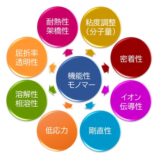 - ポリノルボルネンの特徴機械特性や熱特性、密着性等、用途に応じた機能を盛り込むことができる設計自由度の高さ多様な機能性官能基Rの導入によりイオン導電性の高さを実現
