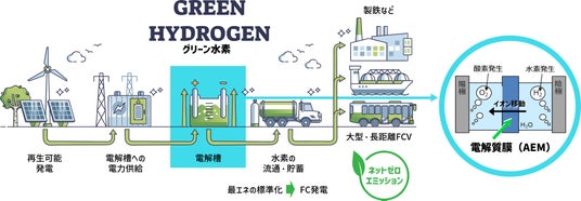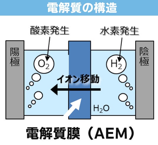 ※1 水素製造装置用アニオン交換膜(AEM:Anion Exchange Membrane)とは、主に水電解装置や燃料電池で使用される膜の一種で、アニオン(負に帯電したイオン)を選択的に透過させる特性を持つ材料です。この膜は、アルカリ性の環境下で動作し、電気化学的反応を効率的に進行させるために重要な役割を果たします。