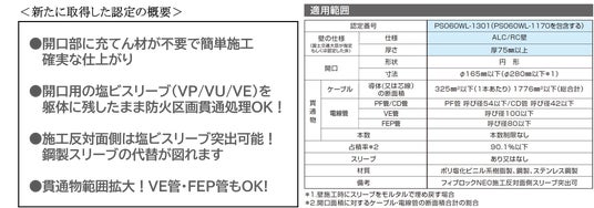 新たな国土交通大臣認定取得で塩ビスリーブをALC/RC壁に残したまま防火区画貫通措置が可能に