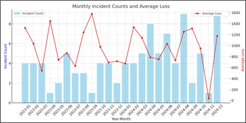 架空のインシデント発生データをexaBase 生成AIに投入し、月ごとの発生件数と損失額を分析して棒グラフと折れ線グラフで可視化するためのプロンプトを入力することで、簡単にグラフを作成。