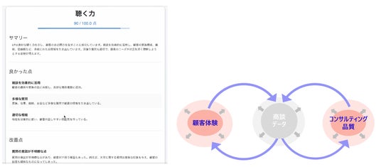 左:ライフプランナーのスキルを評価・改善点をフィードバックする画面のイメージ 右:顧客体験とコンサルティング品質が相互に向上することを表す概念図