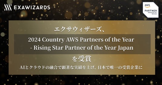 株式会社エクサウィザーズ(本社:東京都港区、代表取締役社長CEO:春田 真、以下エクサウィザーズ)は、Amazon Web Services(AWS)から「AWS Partner Award - Rising Star of the Year Japan(以下本アワード)」を受賞いたしました。本アワードは第三者機関の厳正なる審査を経て決定したもので、2024年中にAWSパートナーとして新規参入し、短期間に卓越した成果を上げた企業に贈られます。日本国内で年間1社のみが選出される賞です。