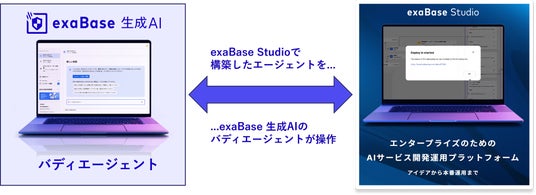 AIエージェント開発・運用プラットフォームである「exaBase Studio」と連携することで、企業が必要とするAIエージェントを「オーダーメイド」で作ることができます。作ったAIエージェントを、バディエージェントが操作することで、より利便性が高くなります。