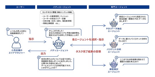 図1:バディエージェントがユーザーの意図を理解し、業務を一気通貫でサポートする流れ