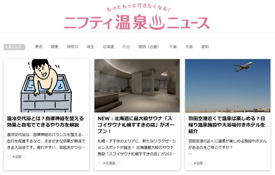 「ニフティ温泉ニュース」は、温泉・サウナ・スパなど、温浴を楽しむための情報を発信する「ニフティ温泉」サイト内のニュースコンテンツです。話題の施設の体験レポートや、新規オープン施設の紹介、近年注目を集めるサウナの楽しみ方など、温浴に関する多彩な情報をお届けしています。