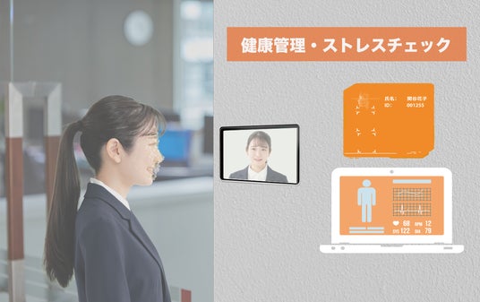 顔認証により本人を特定し、同時に非接触で生体信号を測定し、心身の健康状態をチェックできます。顔認証とrPPG技術を活用することで、心拍数や呼吸数、酸素飽和度、血圧、疲労度、ストレスを測ることができ、付属ユニットを装備すると体温も計測可能です。