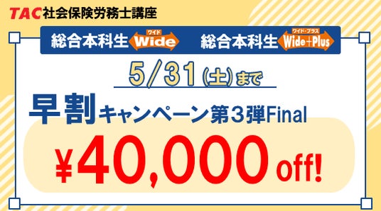 社会保険労務士試験対策講座を展開しているTAC株式会社(東京都千代田区、 代表取締役:多田敏男)は、2026年合格目標「総合本科生Wide」「総合本科生Wide+Plus」の申込みを受付中。「総合本科生Wide」「総合本科生Wide+Plus」は、5・6月に学習を開始できる、今最も「旬」なコース。初学者にも安心の画期的なカリキュラムで、2026年の一発合格を目指すことができる。