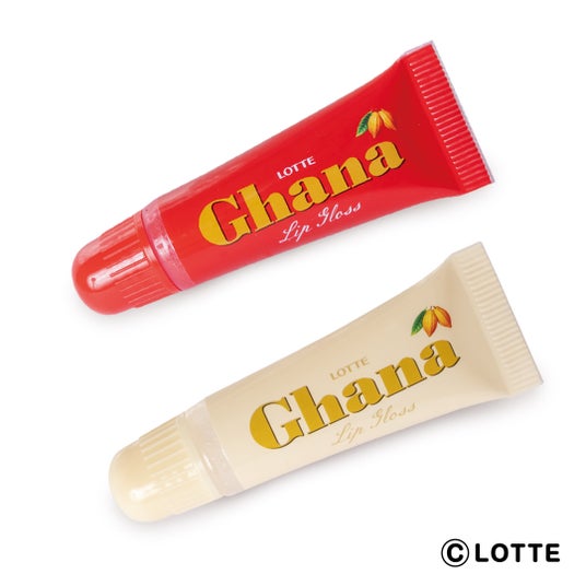 チューブタイプのリップグロス。「ガーナミルク」「ガーナホワイト」のパッケージデザイン。