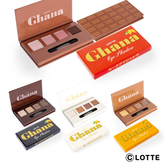 外箱がガーナパッケージデザイン、パレット外面が板チョコデザインの本物の「ガーナチョコレート」そっくりなアイシャドウパレット。パレットにはそれぞれ異なるアイシャドウ4色が入っています。