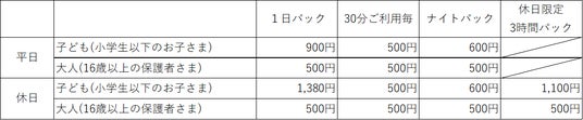 1日パック料金で、追加料金を気にすることなく安心して遊ぶことができます。平日お子さま1名・大人1名の場合、親子合わせて1,400円で1日たっぷり楽しめます。0歳は入場無料です。ナイトパックは平日16時から、休日17時からご利用が可能で、夕方はオトクな料金で遊ぶことができます。
