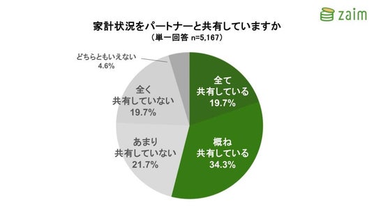 2024年11月にくふうカンパニーが行った調査では、生活を共にするパートナーと家計状況を共有している人は「全て共有している」「概ね共有している」を合わせて54.0%と半数を超えました。