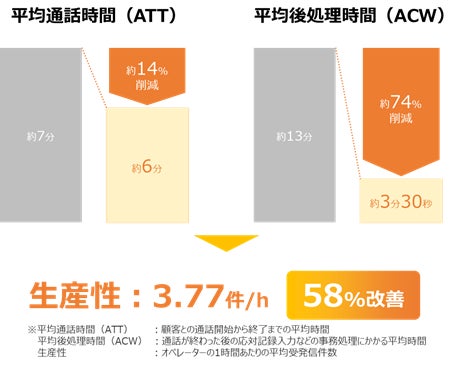 本プロジェクト開始当初の要約精度は、一般的な要約を中心とするものであったため、業務に則したキーワードや重要項目を抽出することが困難な状況でした。今回、NTTマーケティングアクトProCXのノウハウを活用したチューニングなどにより、ほぼ補正することなくそのまま応対要約結果として転記できるようになったことで、オペレーターの平均後処理時間を約74%改善することに成功しました。