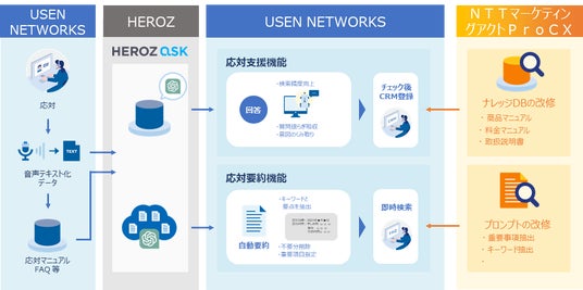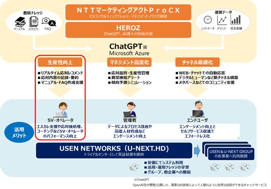 株式会社NTTマーケティングアクトProCX(本社:大阪市都島区、代表取締役社長:長徳 慎二郎、以下、NTTマーケティングアクトProCX)と株式会社U-NEXT HOLDINGS(本社:東京都品川区、代表取締役社長CEO:宇野 康秀)のグループ会社である株式会社USEN NETWORKS(本社:東京都品川区、代表取締役社長:神田 一樹、以下、USEN NETWORKS)およびHEROZ株式会社(本社:東京都港区、代表取締役 林 隆弘・高橋 知裕、以下、HEROZ)は、2023年5月30日に生成AIを活用した「次世代型コンタクトセンター」プロジェクト(以下、本プロジェクト)を始動し、取り組んでまいりました。このたび、第一弾となる「オペレーターサポートの充実化による”生産性向上”」について大幅な業務改善を達成しましたことをお知らせします。