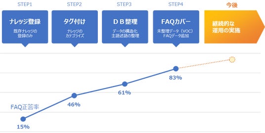 2023年11月に「応対支援機能」 の初期構築を完了しましたが、コンタクトセンターの現場でオペレーターがリアルタイムに利用できるよう継続的な精度向上に取り組むことで、FAQ正答率が当初15%であったものから80%にまで向上させ、オペレーターの平均応対時間を約14%改善することに成功しました。