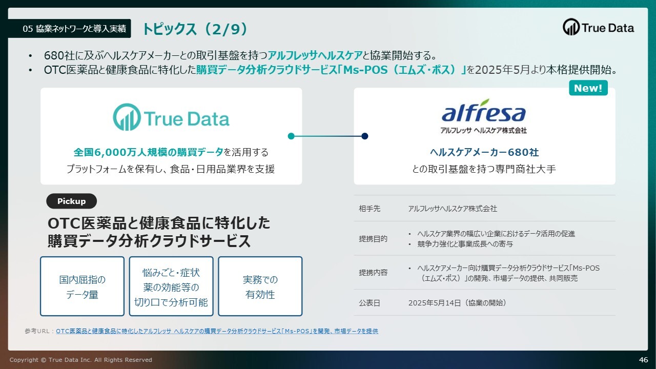 司会者:「アルフレッサ ヘルスケアと協業したヘルスケア商品向けの購買データクラウドサービスについて、概要や特徴と今期の業績貢献の見込みを教えてください」というご質問です。